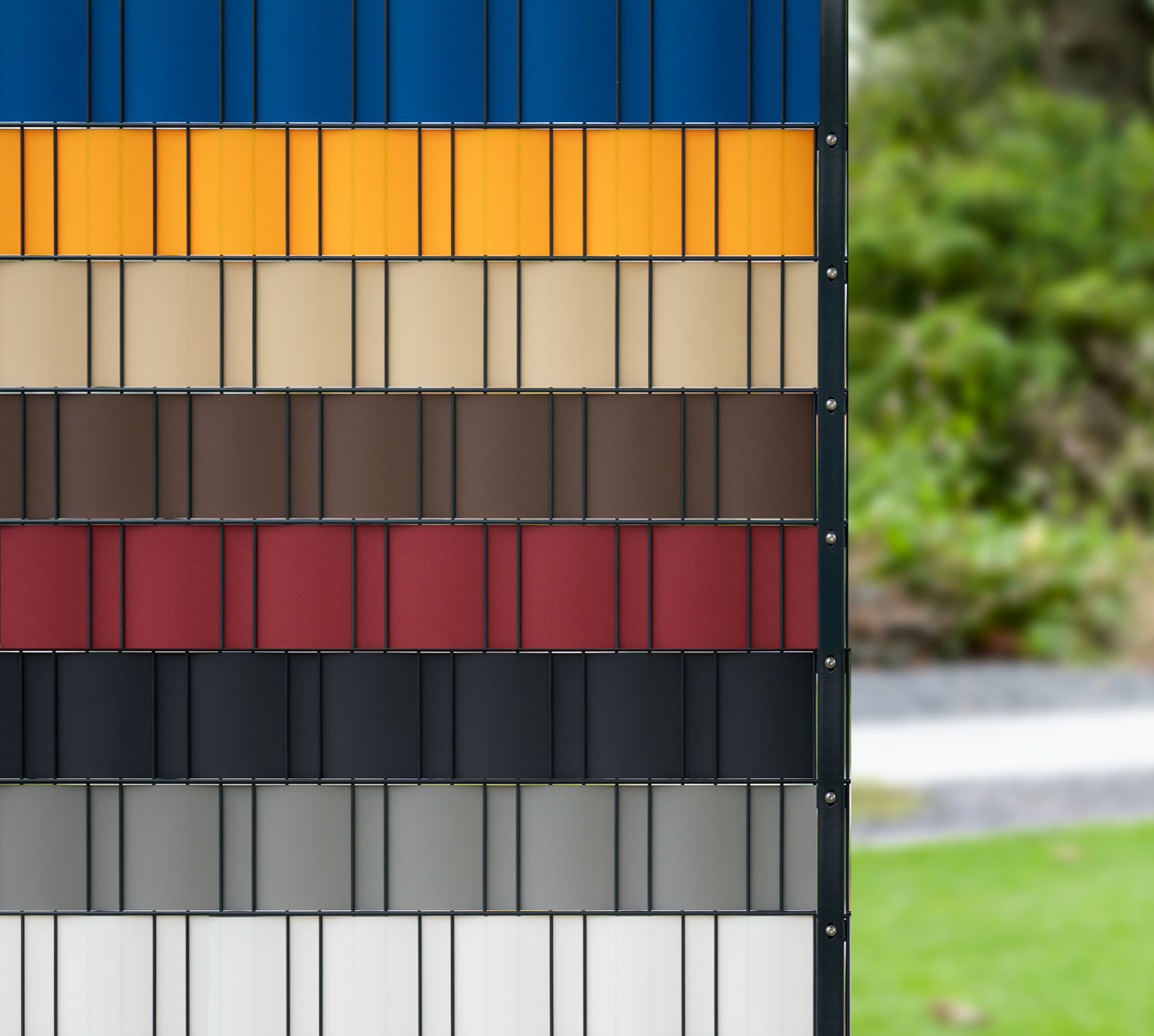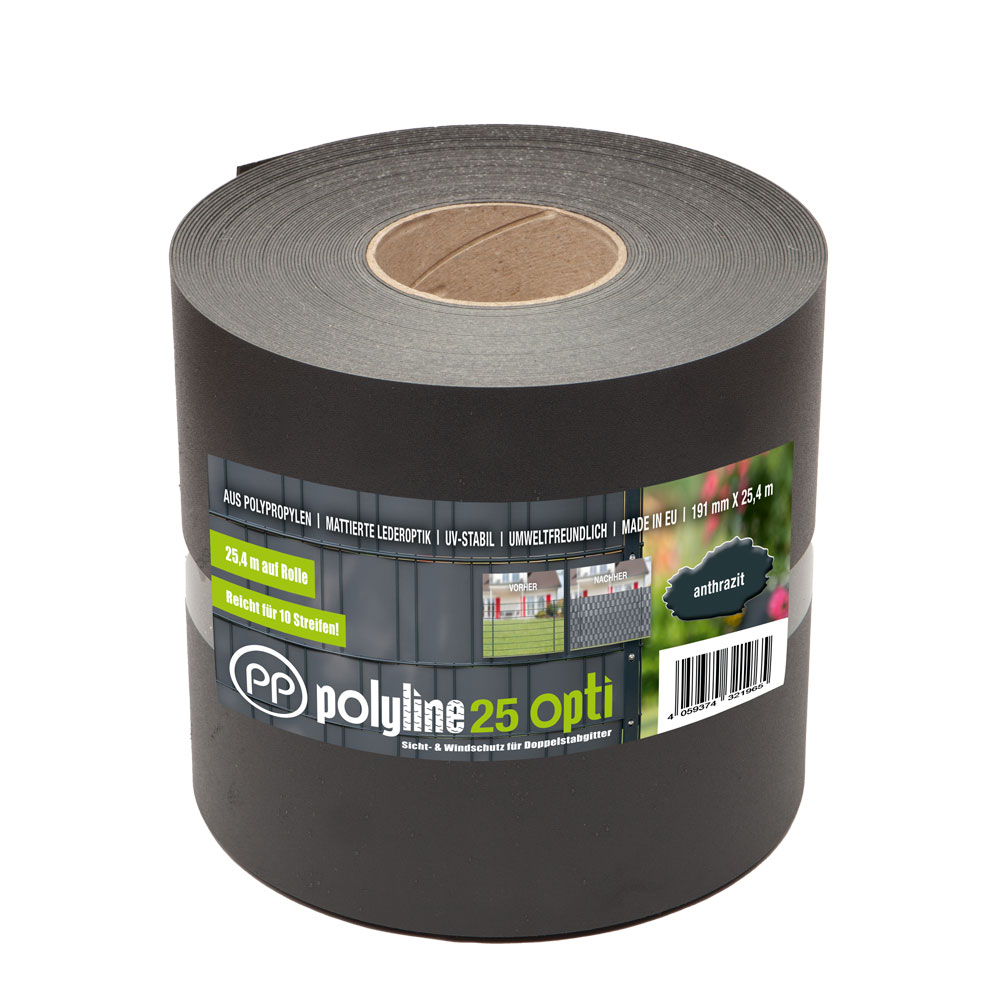 Der Sichtschutz |PP| polyline 25/50 opti ist vielseitig einsetzbar und wird in Doppelstabgittermatten eingeflochten. Die Fixierung erfolgt - abhängig vom gewählten Pfosten - mit Klemmschienen. Darüber hinaus kann er auch als Sichtschutz für Torflügel aus den Serien VARIO trend und VARIO compact verwendet werden.